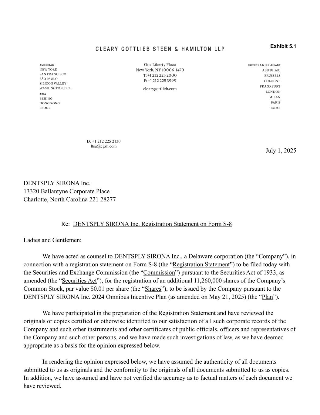 Exhibit 5.1 July 1, 2025 DENTSPLY SIRONA Inc. 13320 Ballantyne Corporate Place Charlotte, North Carolina 221 28277 Re: DENTSPLY SIRONA Inc. Registration Statement on Form S-8 Ladies and Gentlemen: We have acted as counsel to DENTSPLY SIRONA Inc., a Delaware corporation (the “Company”), in connection with a registration statement on Form S-8 (the “Registration Statement”) to be filed today with the Securities and Exchange Commission (the “Commission”) pursuant to the Securities Act of 1933, as amended (the “Securities Act”), for the registration of an additional 11,260,000 shares of the Company’s Common Stock, par value $0.01 per share (the “Shares”), to be issued by the Company pursuant to the DENTSPLY SIRONA Inc. 2024 Omnibus Incentive Plan (as amended on May 21, 2025) (the “Plan”). We have participated in the preparation of the Registration Statement and have reviewed the originals or copies certified or otherwise identified to our satisfaction of all such corporate records of the Company and such other instruments and other certificates of public officials, officers and representatives of the Company and such other persons, and we have made such investigations of law, as we have deemed appropriate as a basis for the opinion expressed below. In rendering the opinion expressed below, we have assumed the authenticity of all documents submitted to us as originals and the conformity to the originals of all documents submitted to us as copies. In addition, we have assumed and have not verified the accuracy as to factual matters of each document we have reviewed. D: +1 212 225 2130 ltsu@cgsh.com
