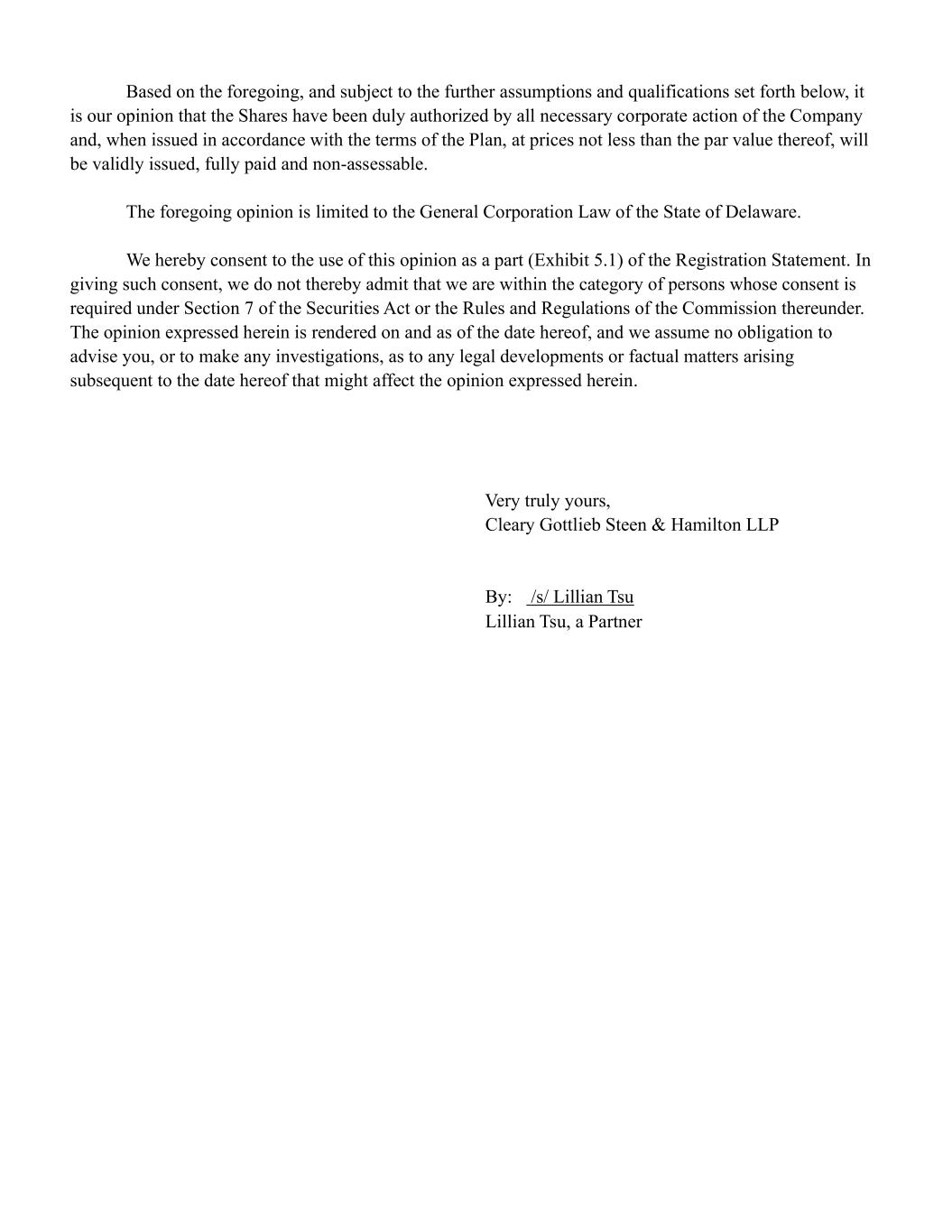 Based on the foregoing, and subject to the further assumptions and qualifications set forth below, it is our opinion that the Shares have been duly authorized by all necessary corporate action of the Company and, when issued in accordance with the terms of the Plan, at prices not less than the par value thereof, will be validly issued, fully paid and non-assessable. The foregoing opinion is limited to the General Corporation Law of the State of Delaware. We hereby consent to the use of this opinion as a part (Exhibit 5.1) of the Registration Statement. In giving such consent, we do not thereby admit that we are within the category of persons whose consent is required under Section 7 of the Securities Act or the Rules and Regulations of the Commission thereunder. The opinion expressed herein is rendered on and as of the date hereof, and we assume no obligation to advise you, or to make any investigations, as to any legal developments or factual matters arising subsequent to the date hereof that might affect the opinion expressed herein. Very truly yours, Cleary Gottlieb Steen & Hamilton LLP By: /s/ Lillian Tsu Lillian Tsu, a Partner